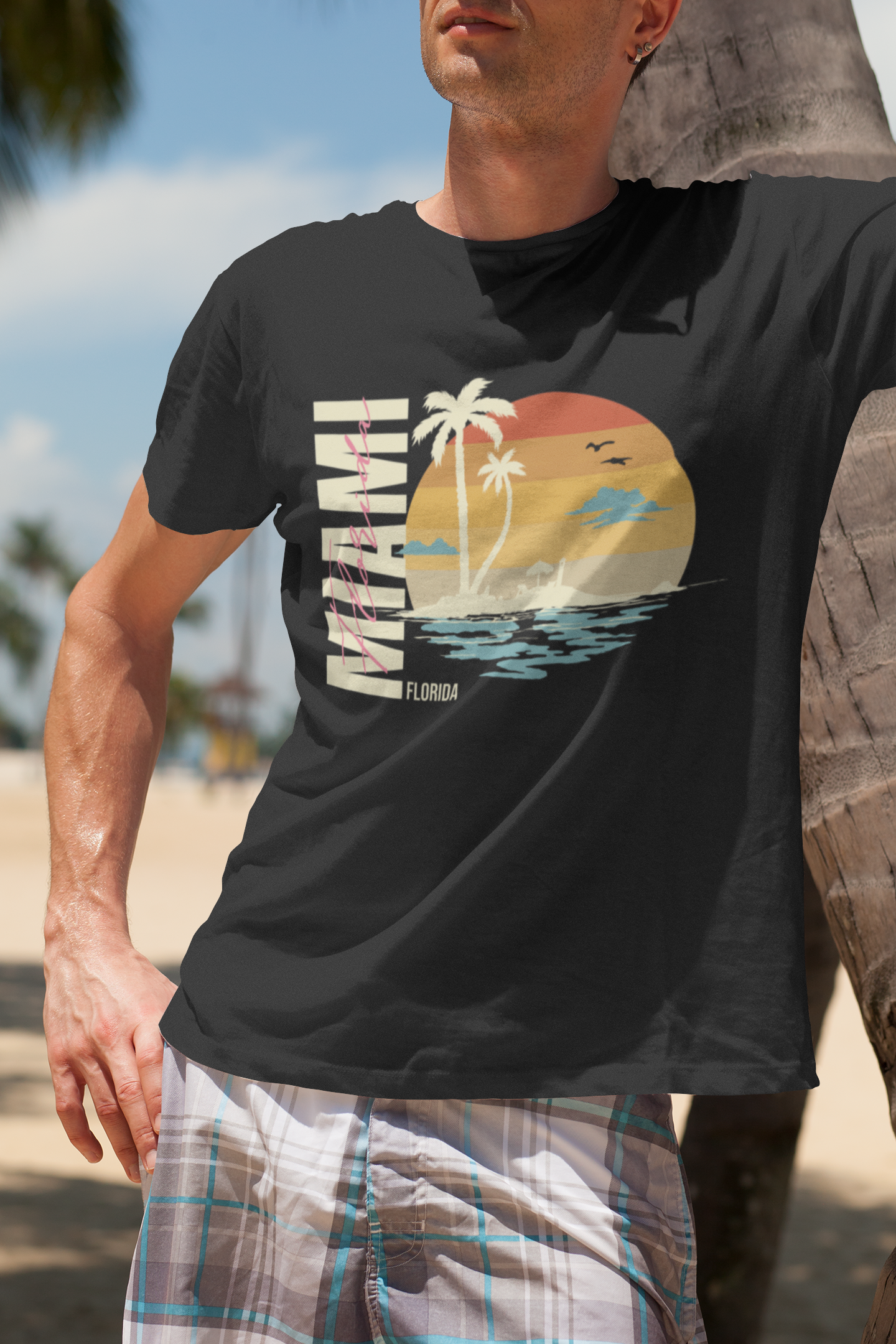 Embrace beach vibes with this stylish Miami Beach Sunset Men's T-Shirt featuring a retro Florida design with palm trees, ocean waves, and a warm sunset. Perfect for vacations, summer getaways, or casual everyday wear. Made with high-quality fabric for a comfortable fit. Whether you're hitting the beach or exploring the city, this t-shirt is a must-have for any Miami or Florida lover.